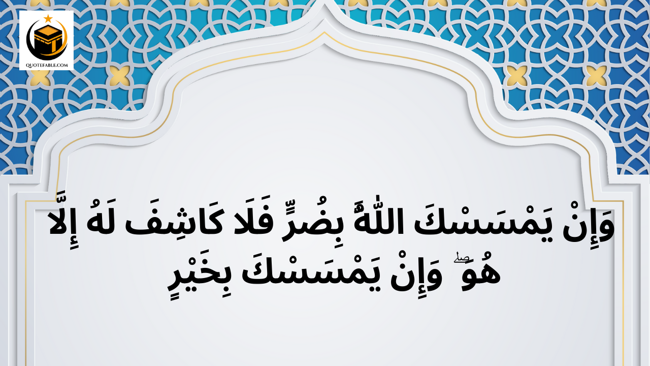 Arabic: وَإِنْ يَمْسَسْكَ اللَّهُ بِضُرٍّ فَلَا كَاشِفَ لَهُ إِلَّا هُوَ ۖ وَإِنْ يَمْسَسْكَ بِخَيْرٍ فَهُوَ عَلَىٰ كُلِّ شَيْءٍ قَدِيرٌ English, And should Allah touch you with evil, there is no such remover away from Him; and that, had He countenanced good united with you, there would be no such repression of His bounteous will. Urdu: اور اگر اللہ تمہیں کوئی تکلیف پہنچائے تو اس کے سوا کوئی اسے دور کرنے والا نہیں، اور اگر وہ تمہیں بھلائی پہنچانا چاہے تو اس کے فضل کو کوئی روکنے والا نہیں۔