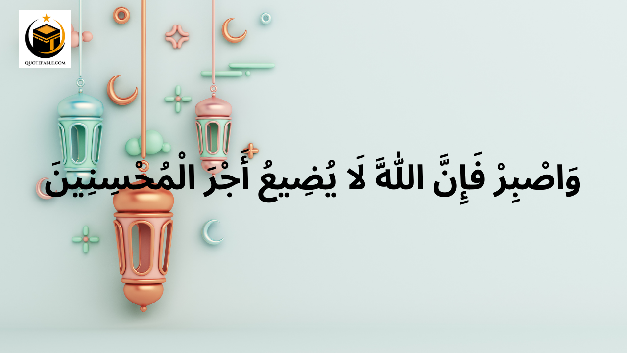 Arabic: وَاصْبِرْ فَإِنَّ اللَّهَ لَا يُضِيعُ أَجْرَ الْمُحْسِنِينَ English: And wait, and, in reality, Allah neither permits the reward of good-doers to be wasted. Urdu: اور صبر کریں، بیشک اللہ نیکوکاروں کا اجر ضائع نہیں کرتا