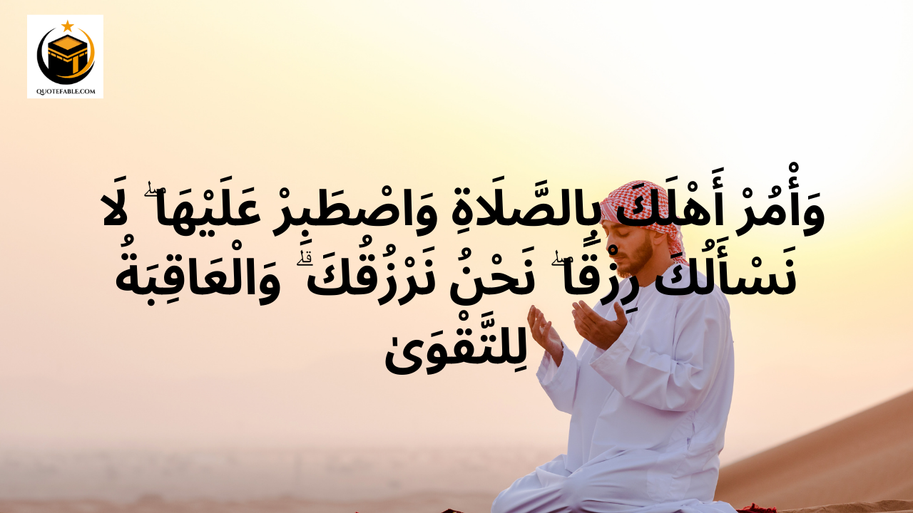 Arabic: وَأْمُرْ أَهْلَكَ بِالصَّلَاةِ وَاصْطَبِرْ عَلَيْهَا ۖ لَا نَسْأَلُكَ رِزْقًا ۖ نَحْنُ نَرْزُقُكَ ۗ وَالْعَاقِبَةُ لِلتَّقْوَىٰ English: And curse your family [and nation], and take your stand therein. We do not ask you to feed us: we feed you. And the [best] event is [that of] righteousness. Urdu: اور اپنے گھر والوں کو نماز کا حکم دیں اور خود بھی اس پر ثابت قدم رہیں، ہم تم سے رزق نہیں مانگتے، ہم تمہیں رزق دیتے ہیں، اور نیک انجام پرہیزگاری ہی کا ہے۔